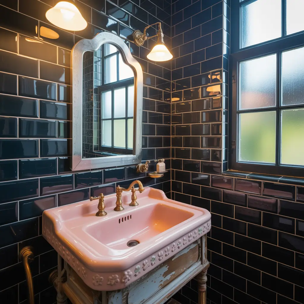Ever seen those vintage pink sinks from the 1950s? They’re pure gold when paired with modern glossy black tiles. This retro-meets-contemporary vibe creates something totally unique.