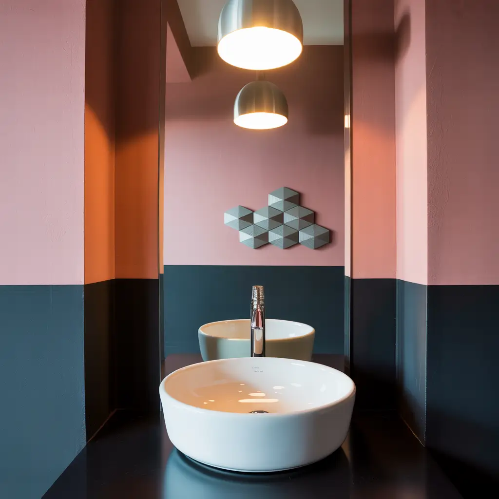I painted the bottom half of my powder room walls matte black and the top half soft pink. Added a thin gold strip where they meet (chair rail style), and boom – instant sophistication. The black grounds the space while the pink keeps it from feeling too heavy. Plus, the black bottom half hides all those inevitable splash marks. :/