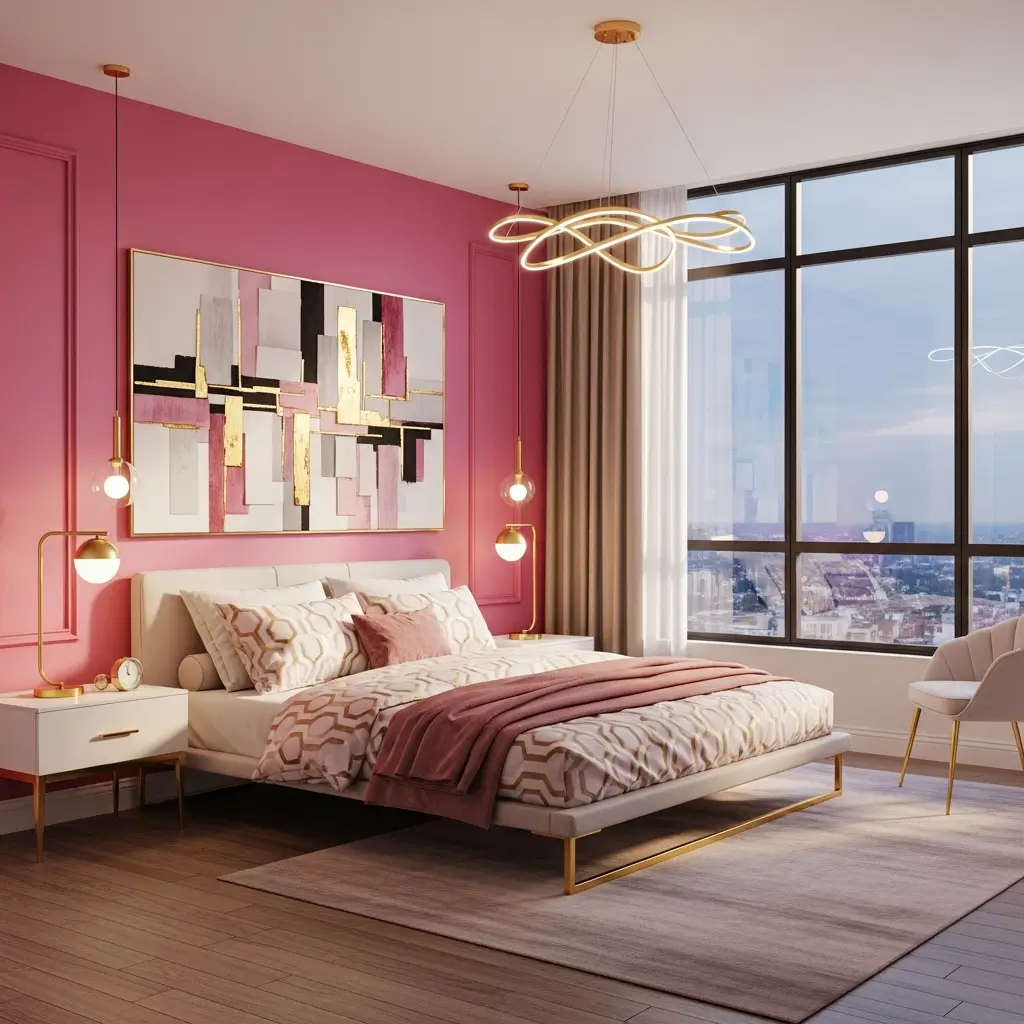 I helped a client who wanted a “cool” pink bedroom, not a “cute” one. We painted one wall a deep rose, almost a millennial pink, and then brought in brushed gold and matte black accents through lighting and furniture. The room now looks like it belongs in a high-end design magazine, effortlessly blending warmth and cutting-edge style.