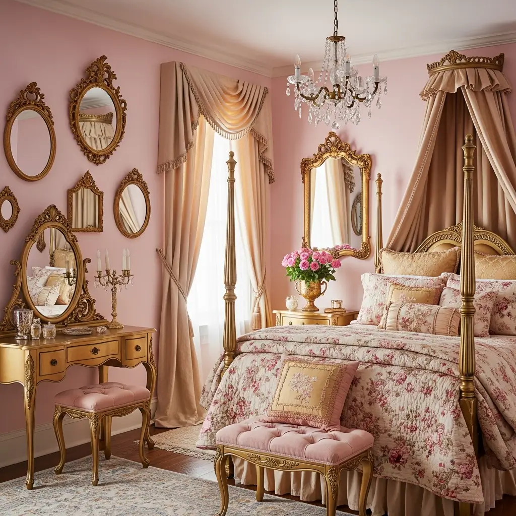 Step back in time with grace and charm. A vintage pink and gold elegance aesthetic brings the beauty of classic patterns and antique touches into your bedroom, softened by lovely pink hues and highlighted with classic gold. It’s about creating a space that feels deeply romantic, nostalgic, and uniquely charming, like a cherished heirloom come to life.