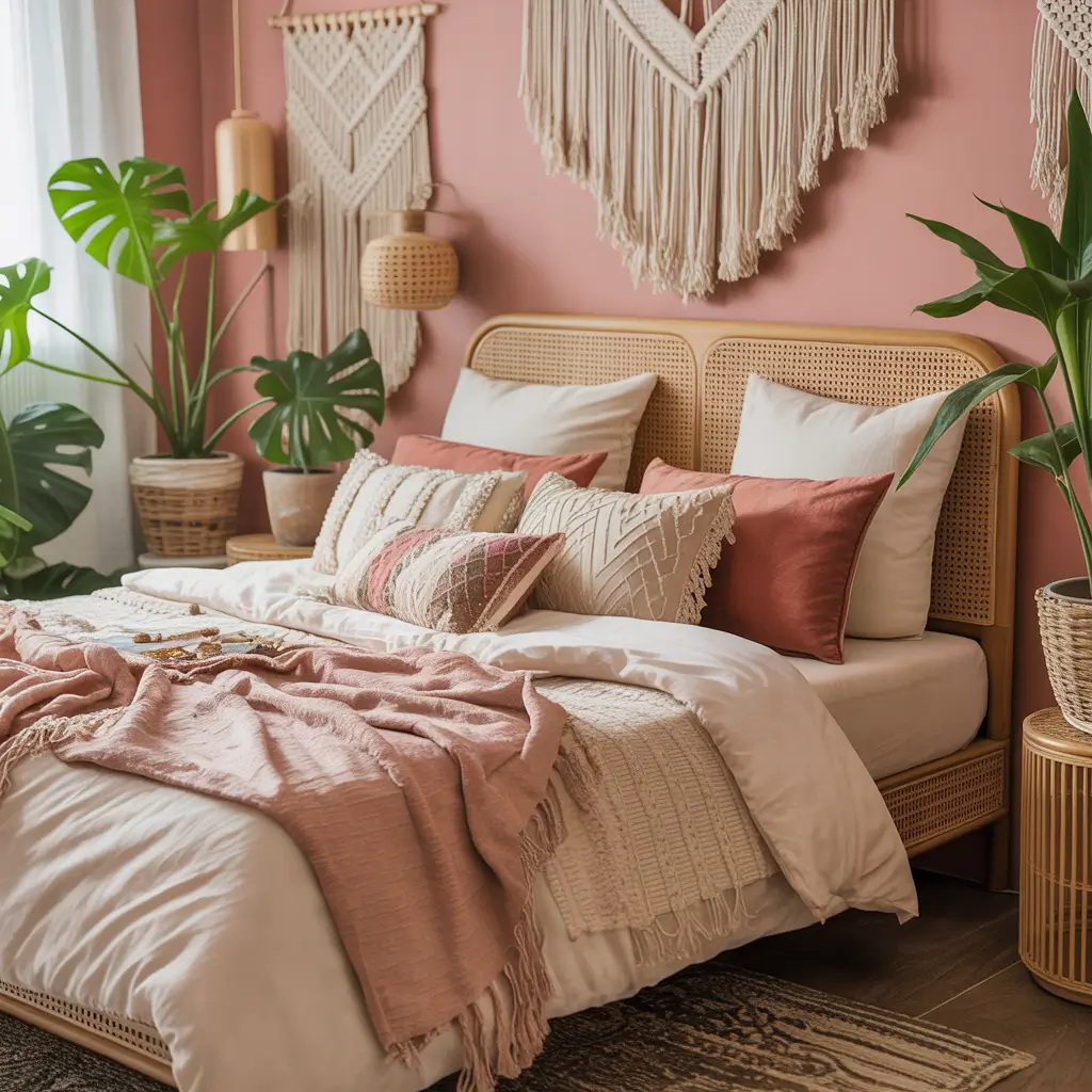 - Layered Textures: This is crucial for boho. Think macramé wall hangings in natural white, woven jute rugs, chunky knit pink blankets, and linen bedding in varying shades of pink and white.