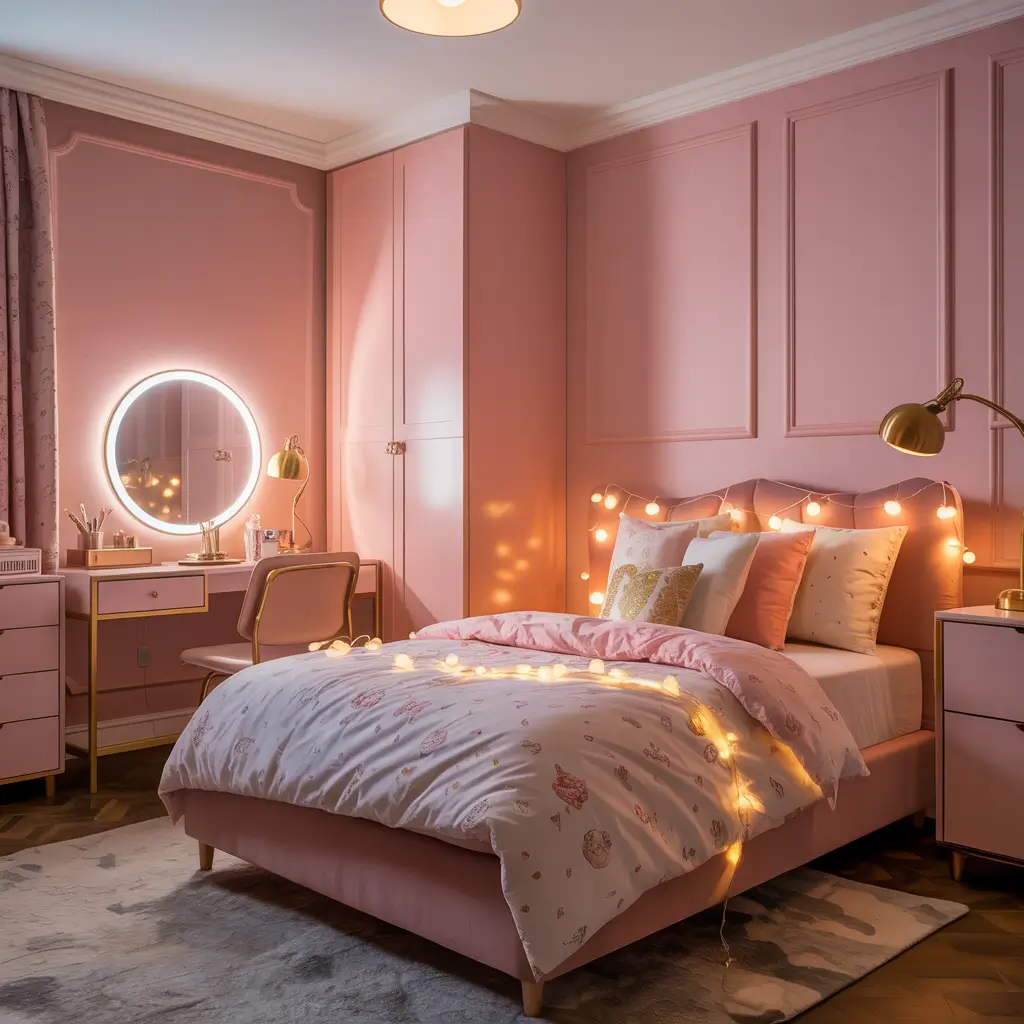 - Display Their Passions: Incorporate shelving or a white corkboard wall for displaying photos, artwork, and personal collections. Gold frames or pink accessories can tie it into the decor.