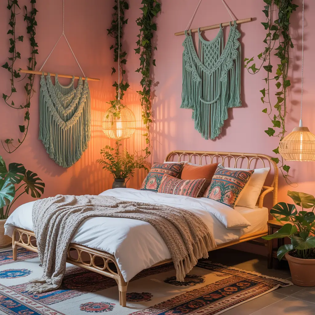 Oh, boho, how I love thee. The pink and green boho chic bedroom is probably my favorite interpretation of this color duo. It embraces natural textures, free-spirited patterns, and a lived-in, eclectic charm that feels incredibly inviting. This isn’t your grandma’s boho; this is intentional, vibrant, and utterly stylish.