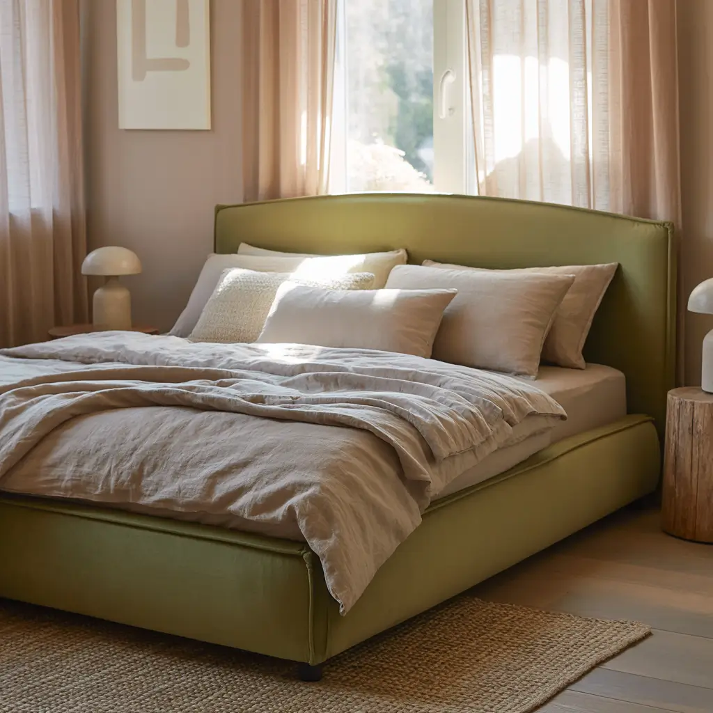 • Earthy Furniture: Opt for olive green furniture pieces – perhaps a velvet bench at the foot of the bed, an upholstered armchair, or even painted wooden nightstands.