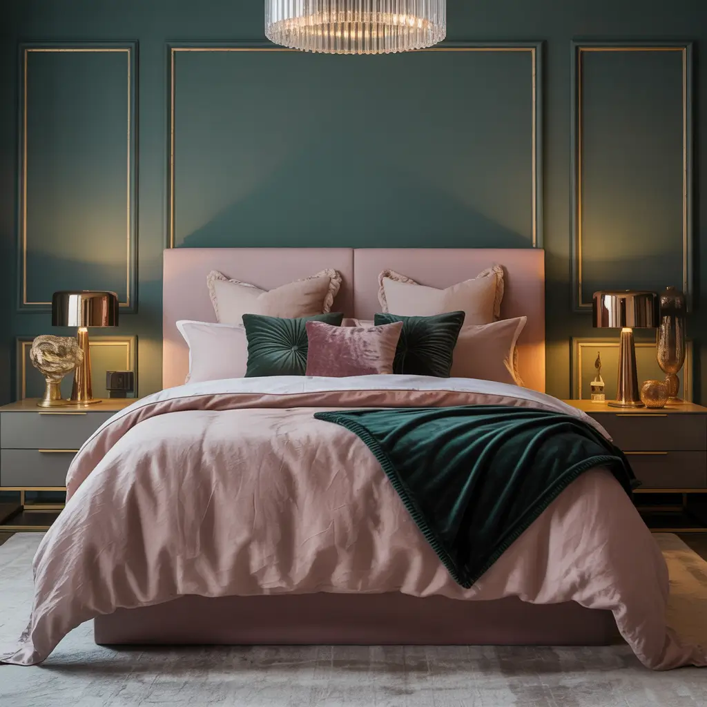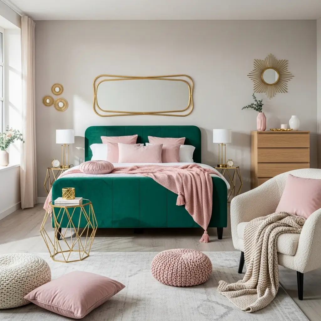 • Metallic Touches: Gold or brass hardware and accessories will enhance the luxurious feel of the emerald and pink pairing.