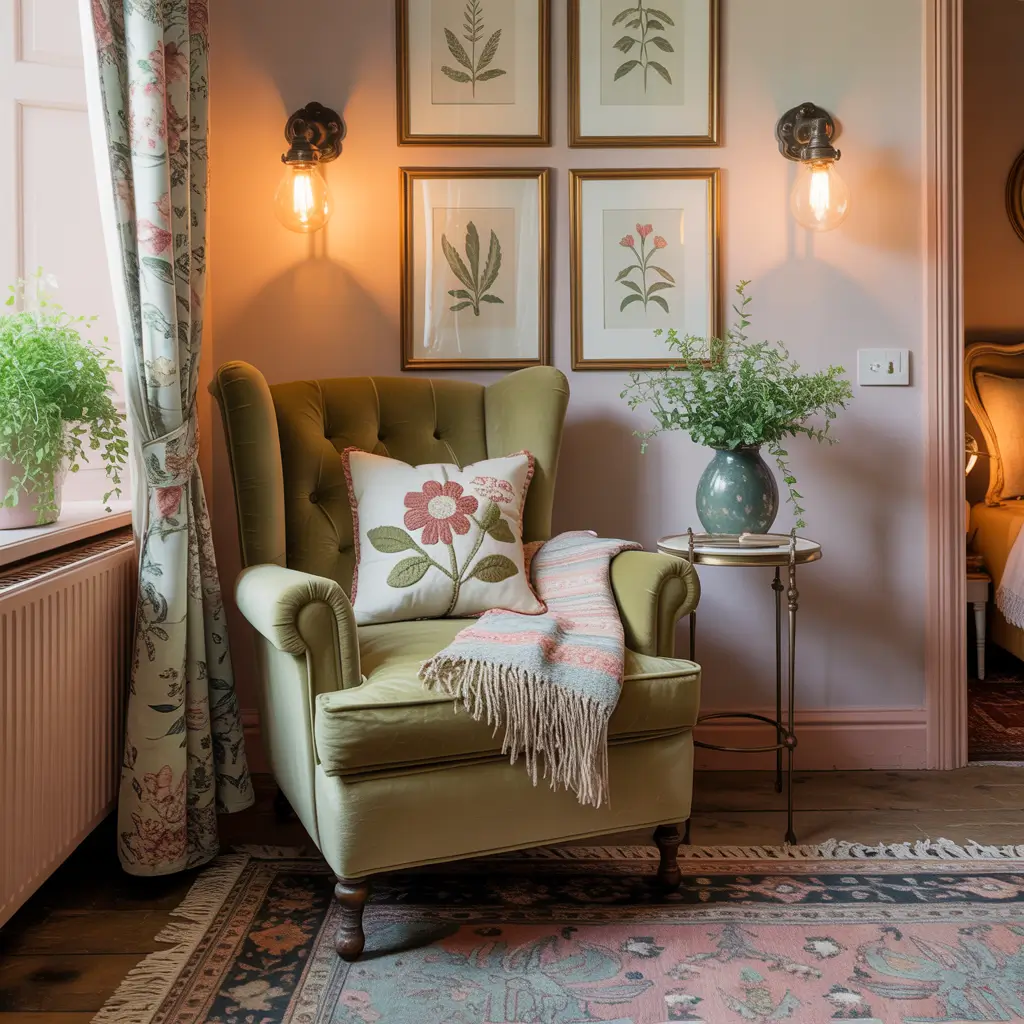 • Metallic Shine: Add gold or brass accents – lamp bases, picture frames, or a decorative mirror. These metallics bridge the pink and green beautifully and amplify the luxe feel.