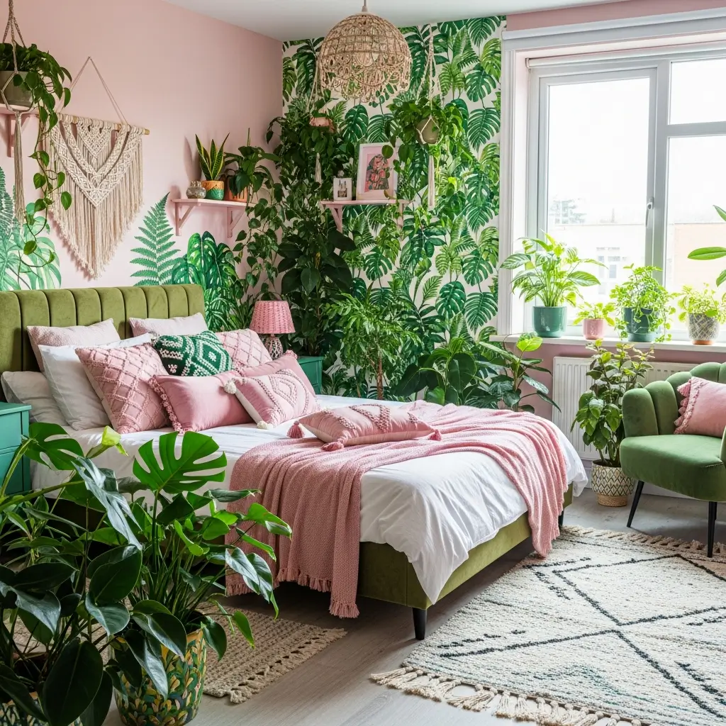 • Texture Play: Layer natural textures like a jute rug, rattan furniture, and macramé wall hangings. Mix these with pink and green textiles in linen, cotton, and even velvet.