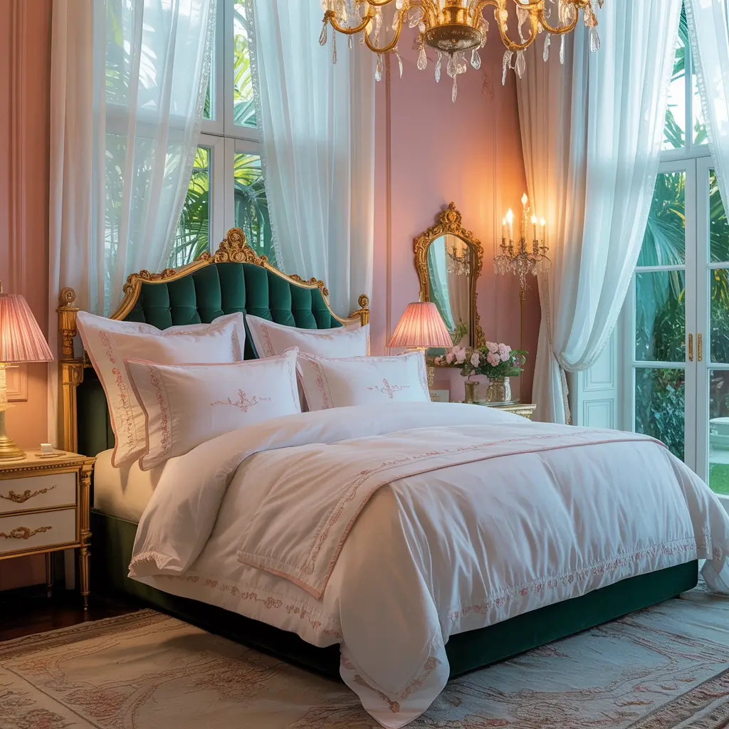 For maximum luxury, pink and emerald green in rich textures create a bedroom fit for royalty (or at least makes you feel like it).