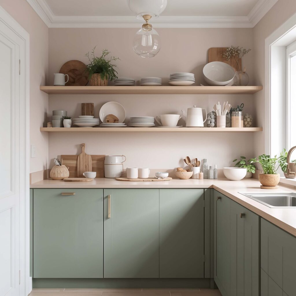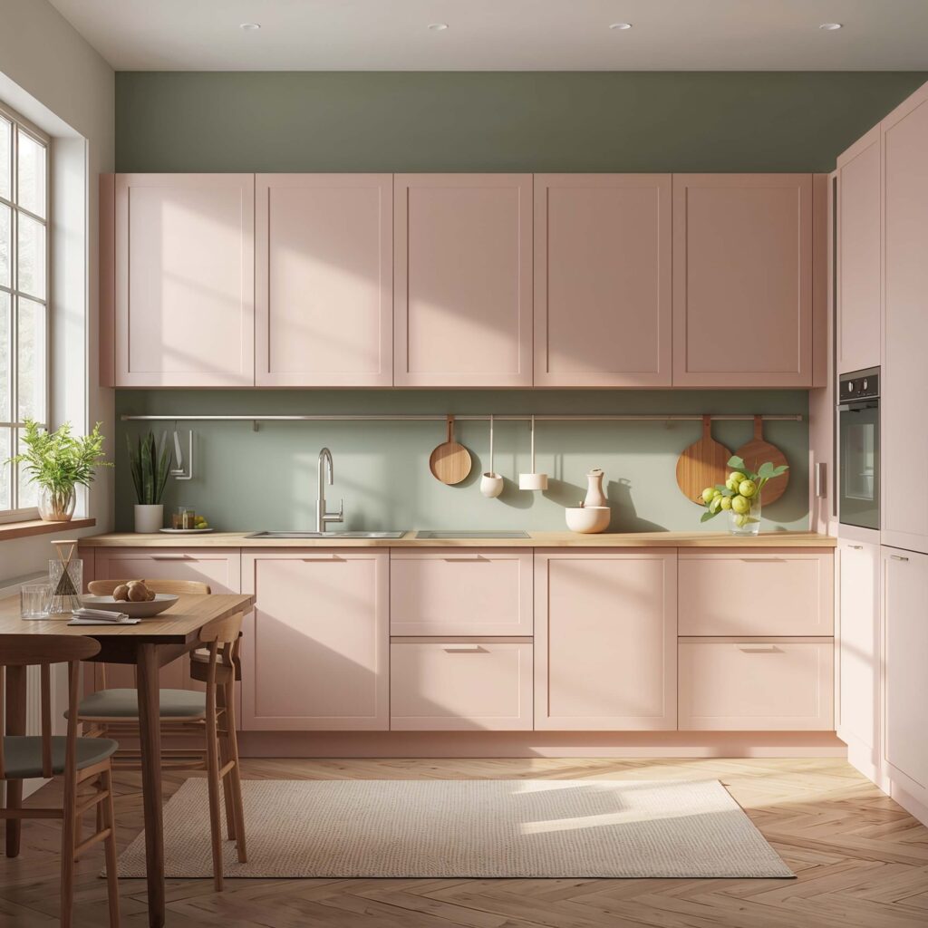 Let me start with my absolute favorite combination. Soft pink cabinets paired with sage green walls create this dreamy, calming atmosphere that makes you actually want to spend time cooking. I discovered this combo completely by accident when I was scrolling through Pinterest at 2 AM (we’ve all been there, right?).