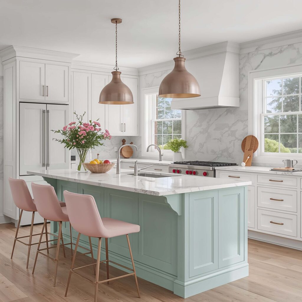 Okay, this one’s for those of you who want to dip your toes into the pink and green pool without going full cannonball. A mint green kitchen island with strategically placed blush accents gives you that color pop without overwhelming the space.