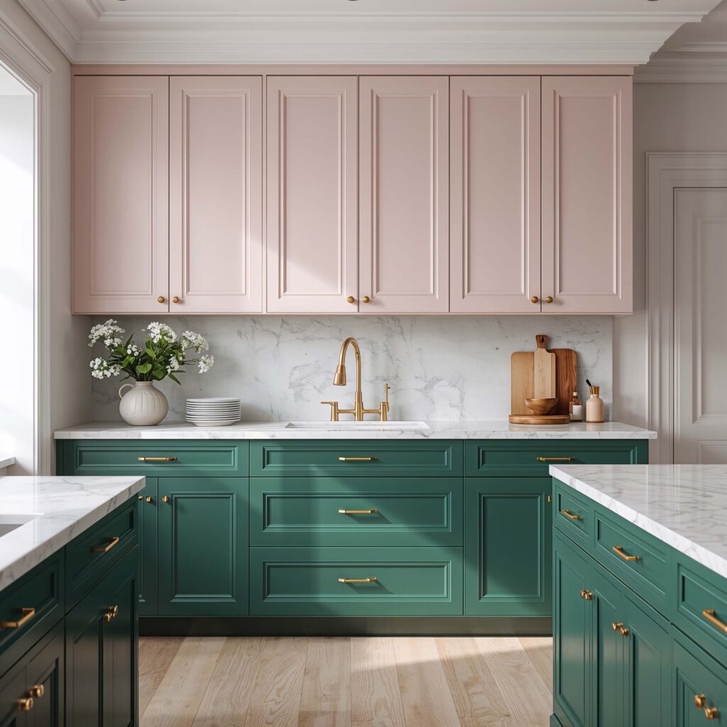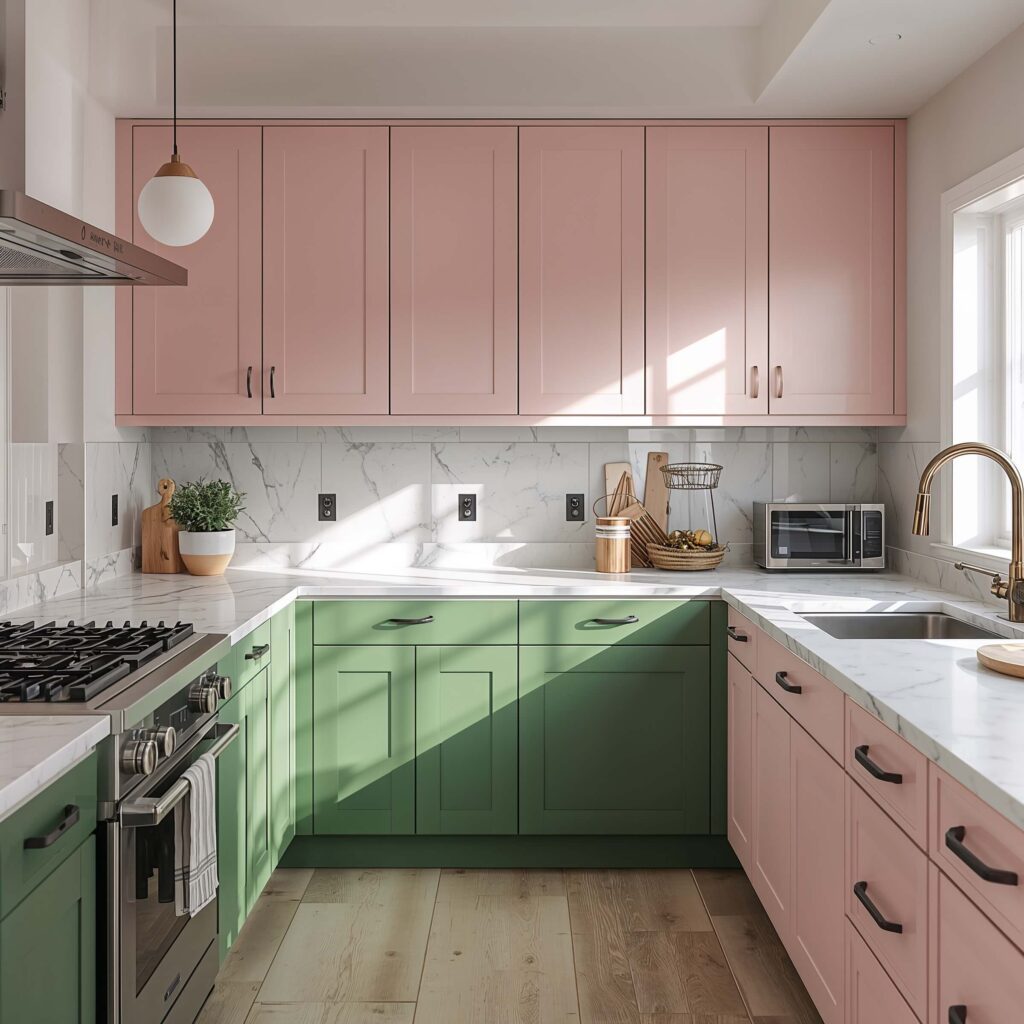 Two-tone cabinets have been trending for years, but pink and green? That’s next level. The key is choosing shades that complement rather than clash. Think sage and blush, mint and coral, or olive and rose.