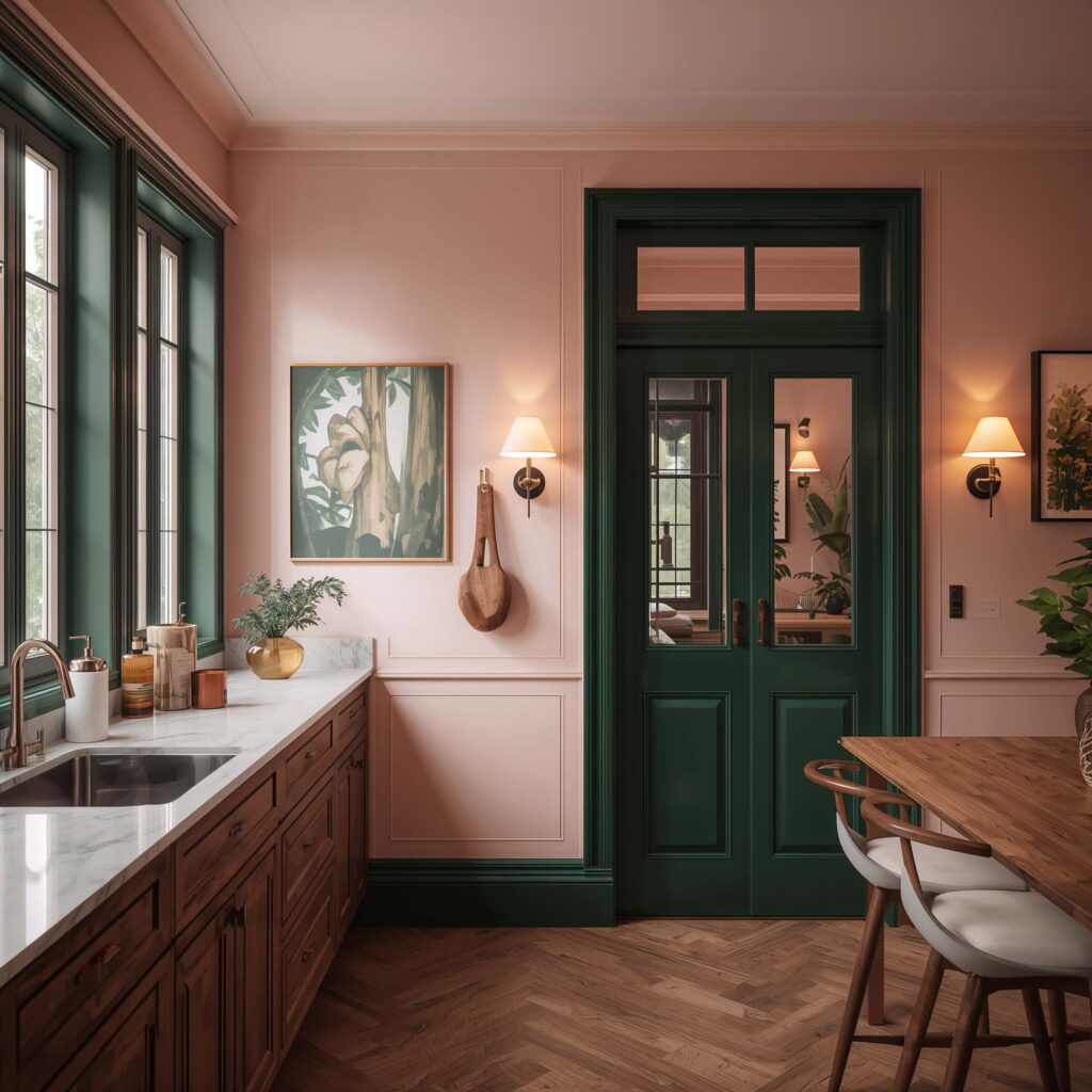 This one’s a bit unconventional, but stick with me. Instead of the typical white trim, imagine deep forest green trim against blush pink walls. It’s like framing a beautiful painting – the green defines and enhances the pink rather than competing with it.