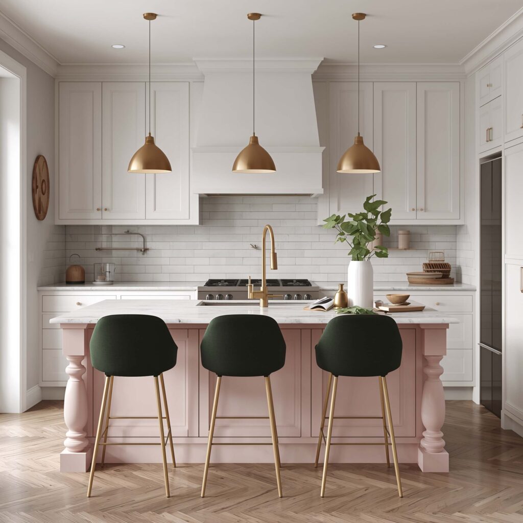 I actually tried this in my own kitchen last spring. Started with a basic white kitchen, painted the island this gorgeous mint shade, then added blush bar stools and some rose-gold pendant lights. The transformation? Chef’s kiss.