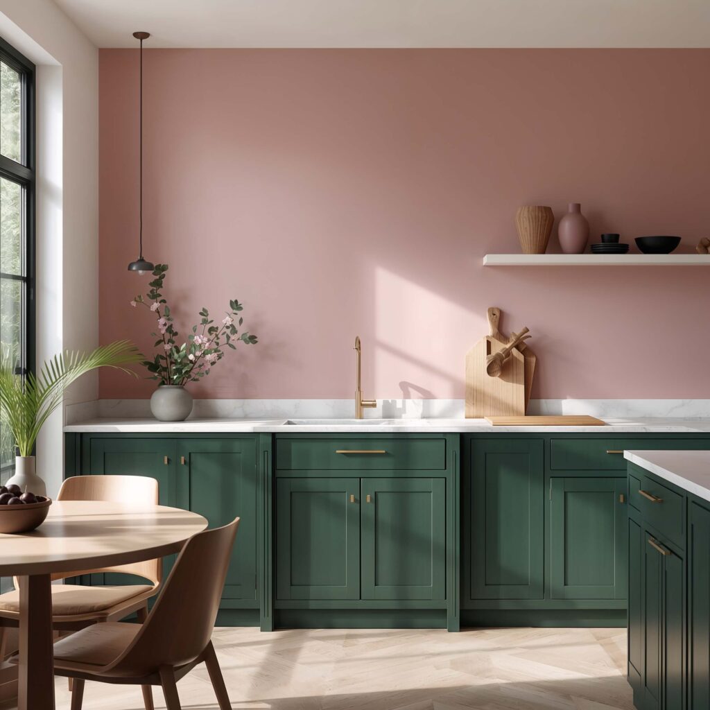 Can’t commit to pink cabinets? An accent wall might be your answer. One statement pink wall behind green cabinets creates depth and interest without overwhelming the space.