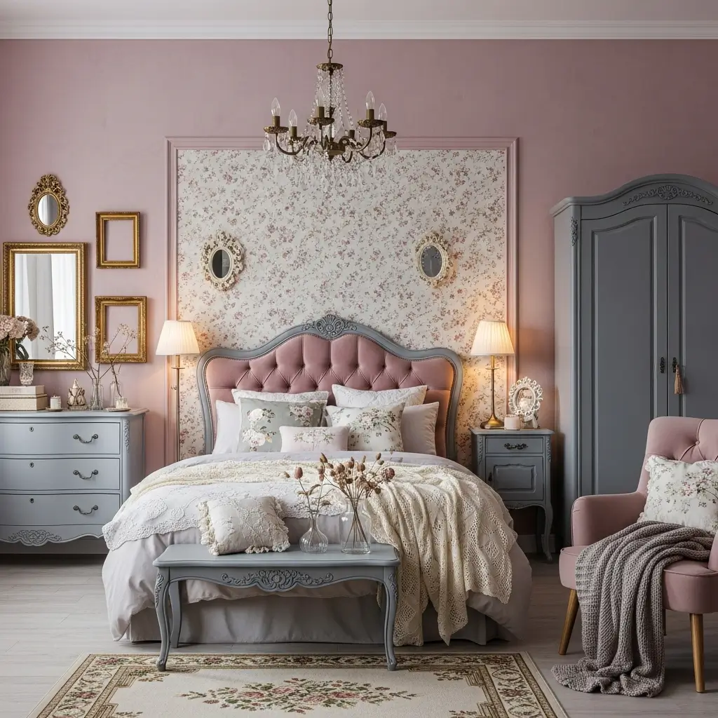 - Antique Finds: Incorporate vintage furniture pieces like a distressed grey armoire, a wrought iron bed frame, or ornate bedside tables.