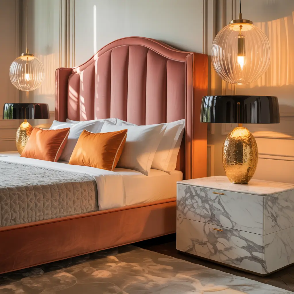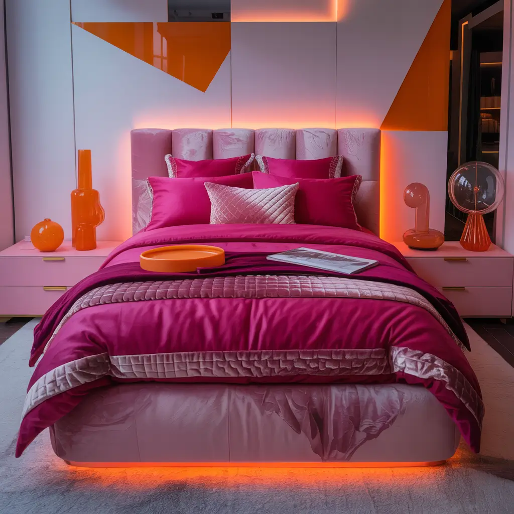 Invest in one showstopper pink velvet piece – an upholstered bed frame hits different, let me tell you. Then bring in citrus orange through glossy accessories, metallic accents, and strategic pops of color that catch the light.