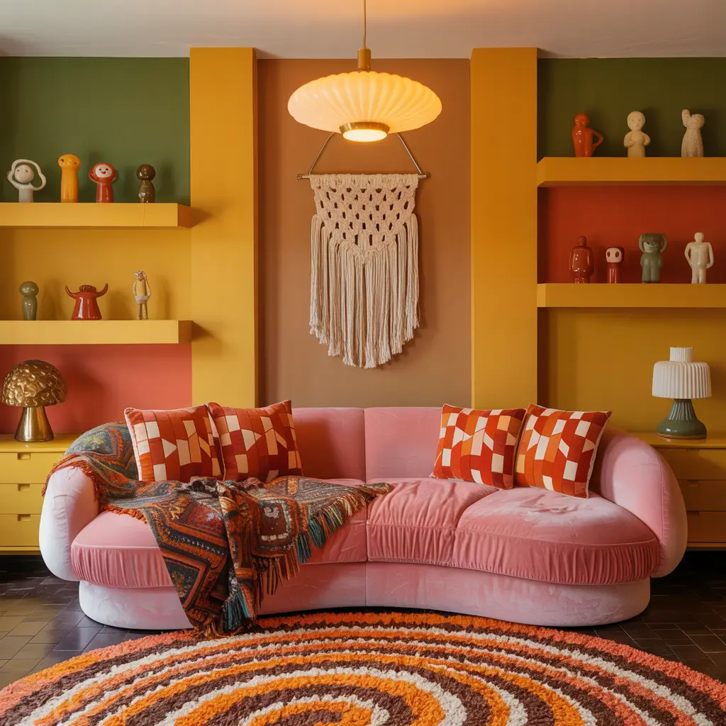 Think bubblegum pink meeting burnt sienna orange. Add some curved furniture, geometric patterns, and maybe a mushroom lamp (yes, they’re back), and you’ve got yourself a certified vibe.