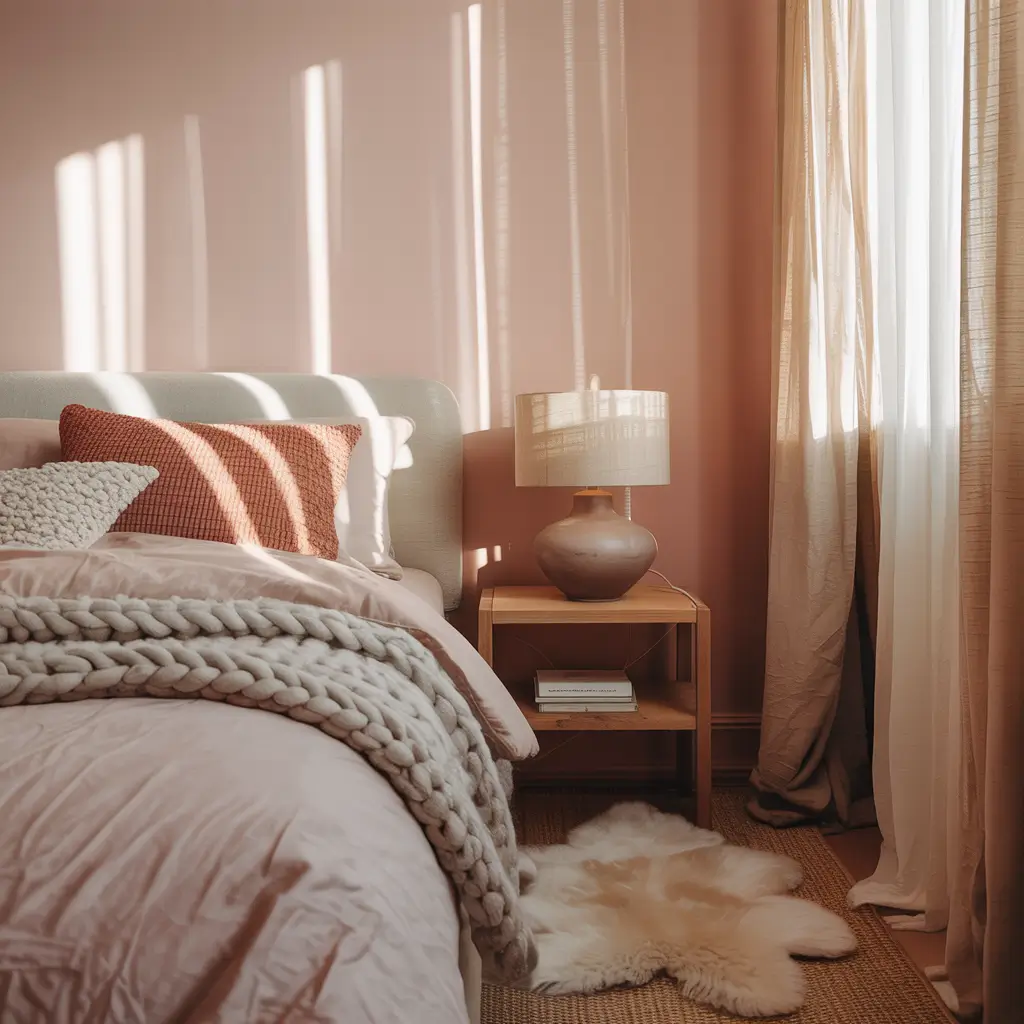 Paint your walls the softest pink – think ballet slipper or rose quartz. Then layer in muted orange through textured elements like a chunky knit throw, linen curtains, or a tufted bench at the foot of your bed.