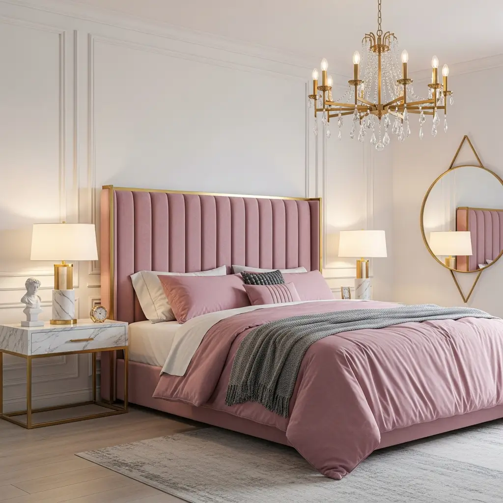 - Velvet or Silk Textures: A pink velvet upholstered headboard, silk throw pillows, or velvet curtains add richness and a tactile sense of luxury.