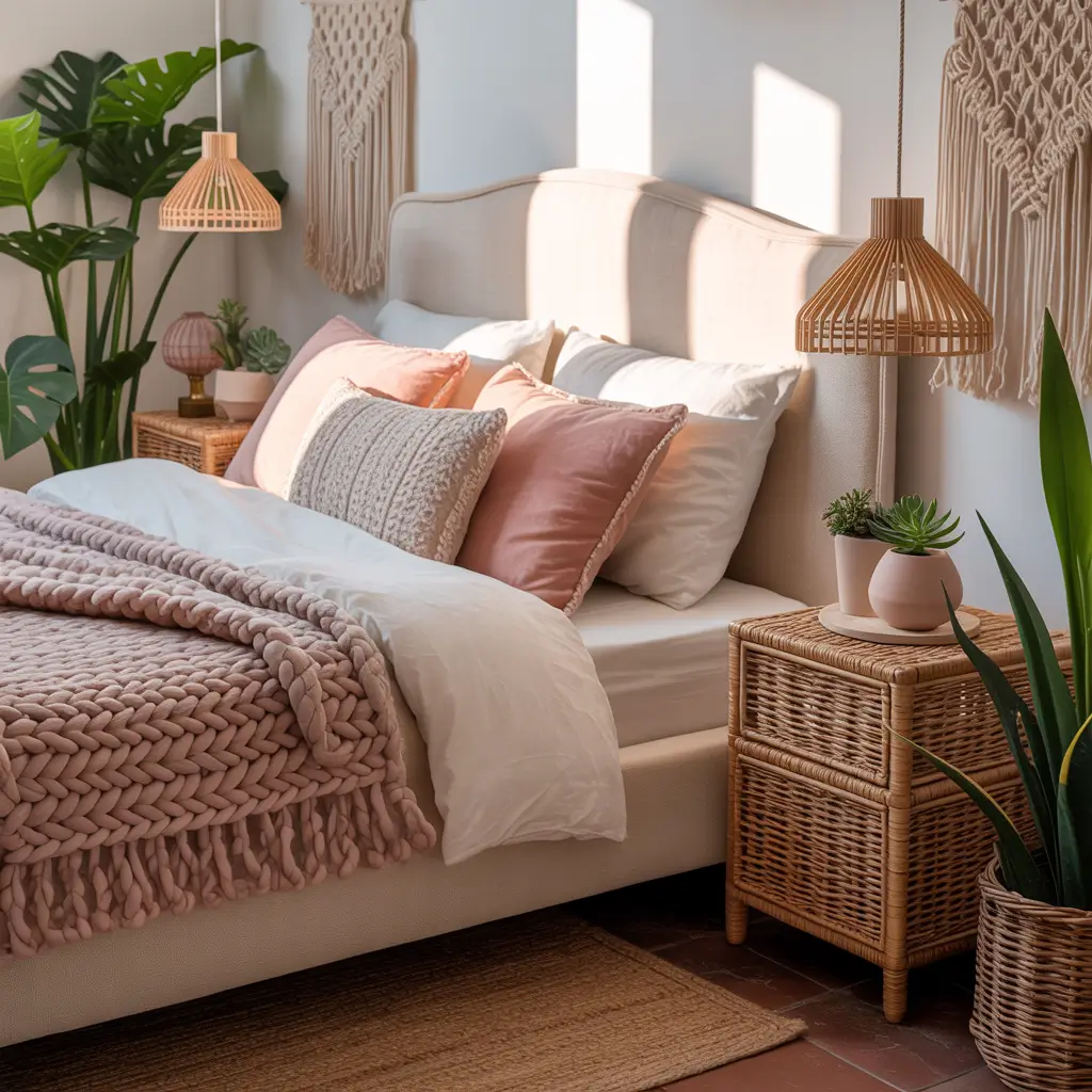 Who says boho needs every color of the rainbow? Pink and white boho strips away the color chaos while keeping all that laid-back, collected-over-time charm. It’s bohemian style for people who actually want to relax in their bedrooms.