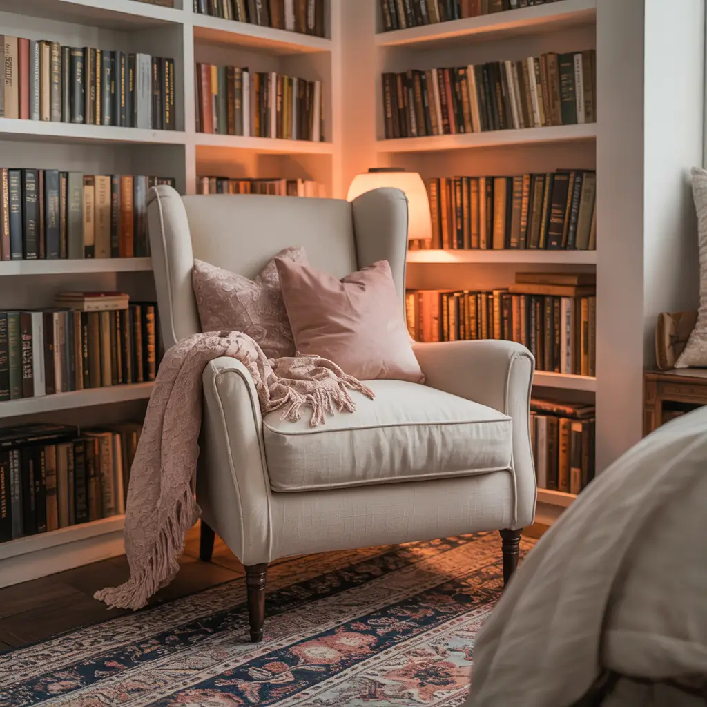 You don’t need a massive bedroom to create a reading nook. That awkward corner, the space by the window, even the foot of your bed can transform into a cozy reading spot with the right approach. Pink and white makes these small spaces feel intentional rather than leftover.