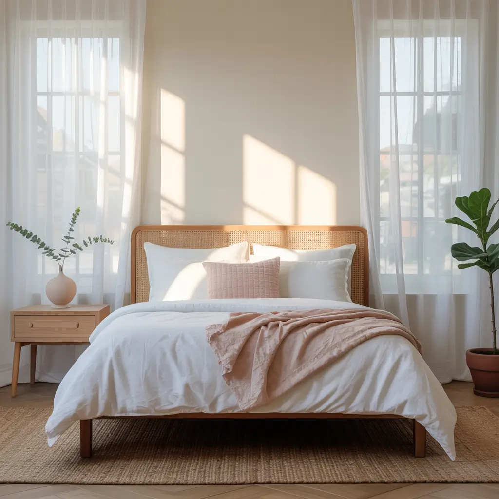 - Choose one soft blush element as your focal point (walls or bedding, not both)