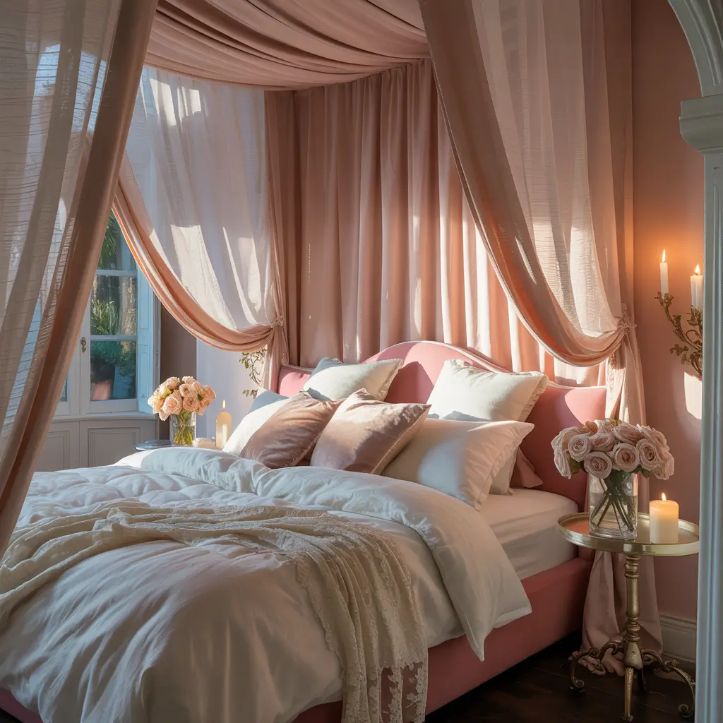 No four-poster bed? No problem. Create canopy effects with ceiling-mounted curtain rods, wall-mounted fabric panels, or even a simple mosquito net in pink or white. These alternatives deliver canopy romance at a fraction of the cost and commitment. 🙂