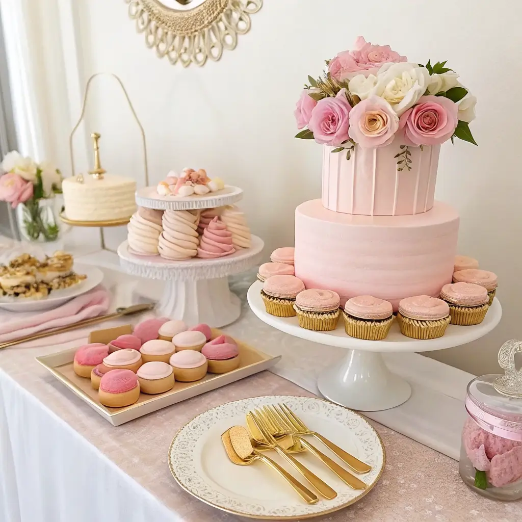 blush and gold dessert table feels classy without trying too hard. It gives your guests something pretty to admire and something sweet to grab, which feels like a fair deal.