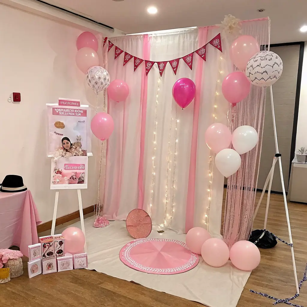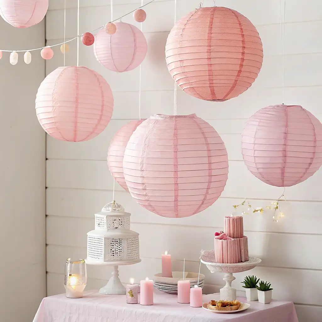 If you want to decorate upward and make the whole room feel more immersive, use pastel pink hanging paper lanterns. Ceiling decor changes the vibe fast, and people always notice it because most party setups ignore that space.