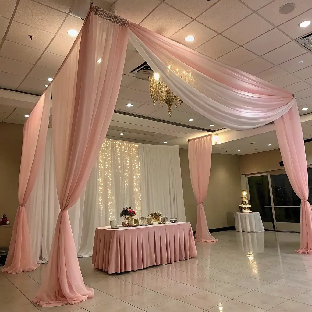 • Soft pink draped ceiling decor