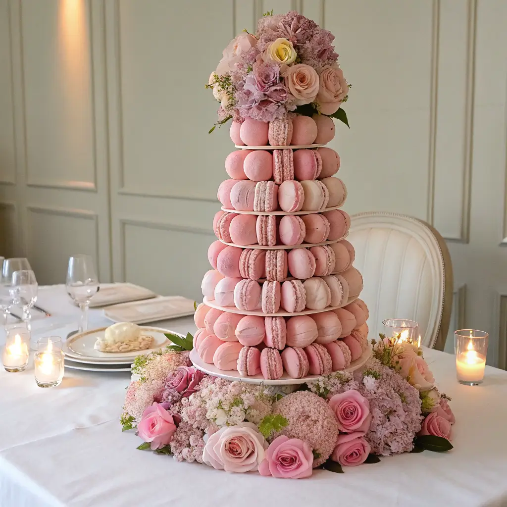 pink macaron tower centerpiece brings elegance and sweetness together in one very photogenic package. It looks fancy, tastes amazing, and saves you from relying on flowers alone for centerpieces.