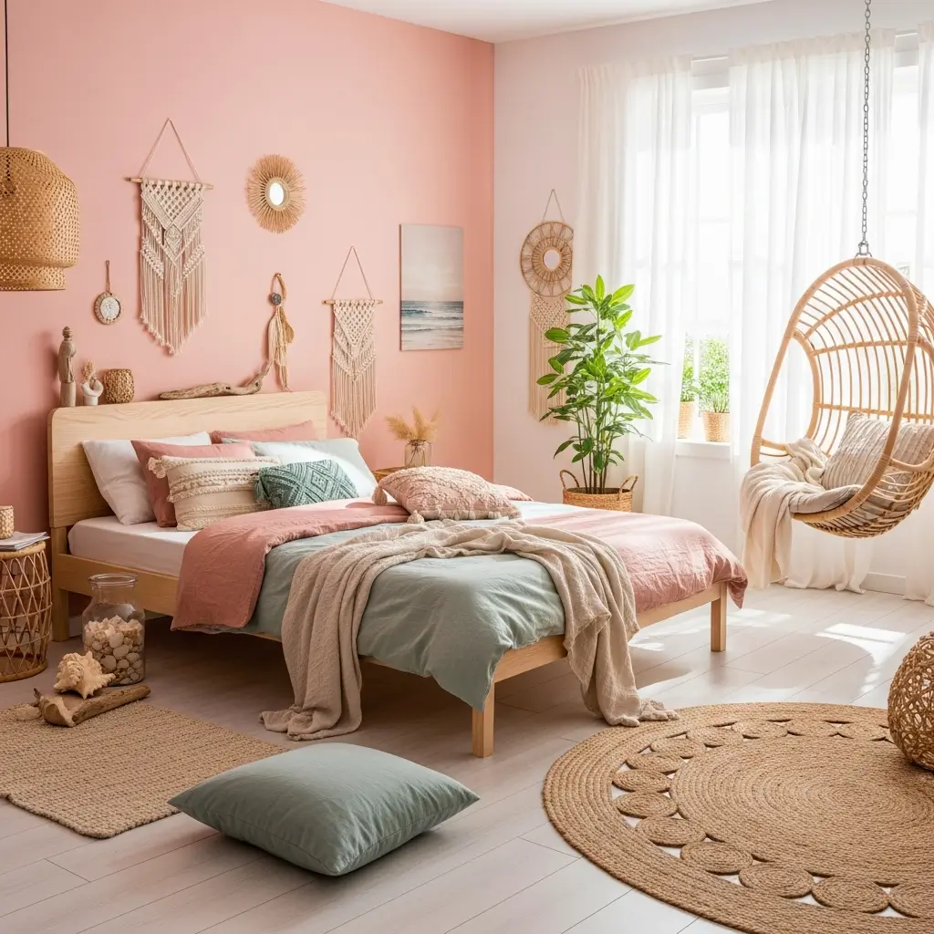Bohemian meets coastal meets pink? Yes, please. Pink coastal boho style combines free-spirited design with beachy elements, creating bedrooms that feel both relaxed and romantic. This isn’t your typical macramé-heavy boho – it’s refined and coastal-appropriate.