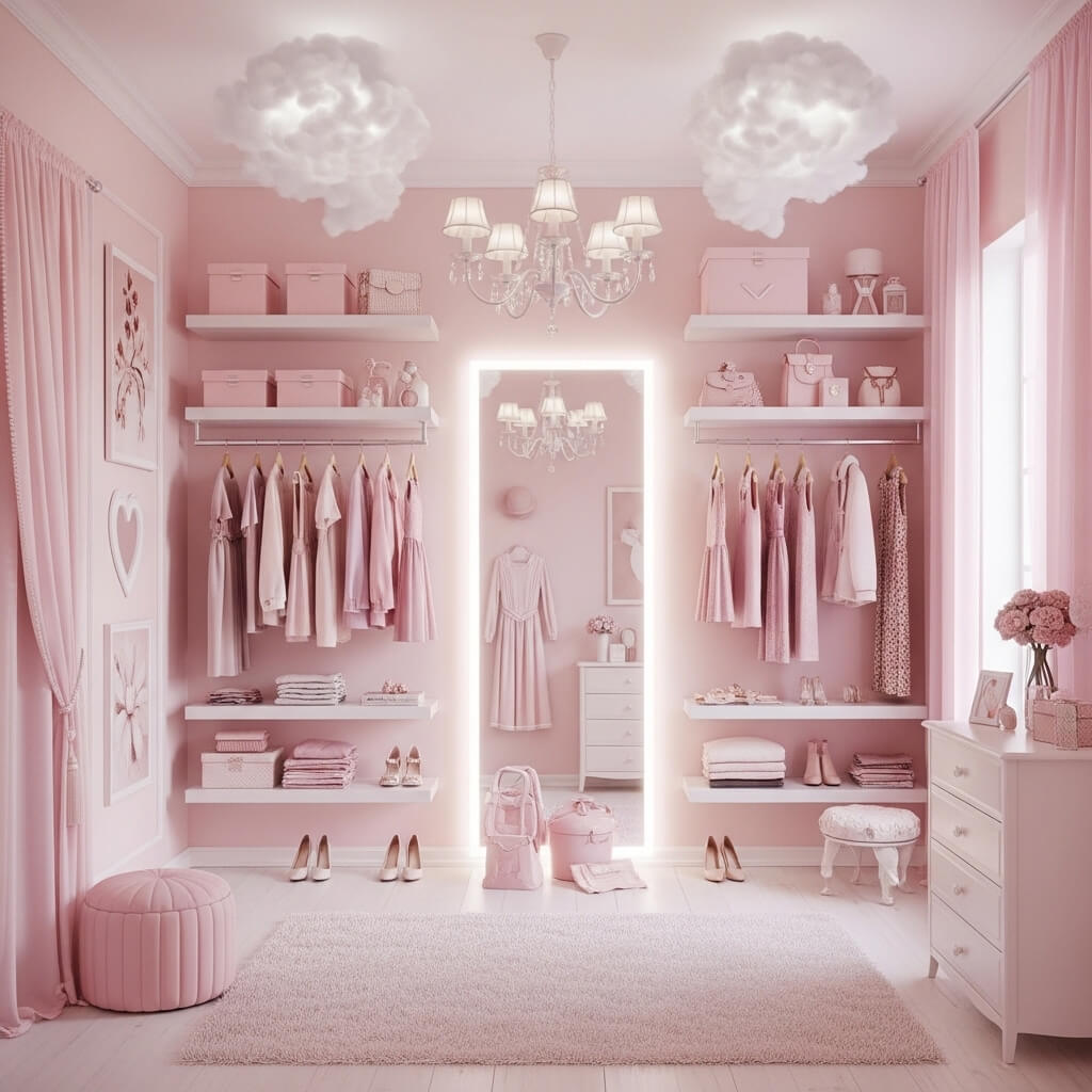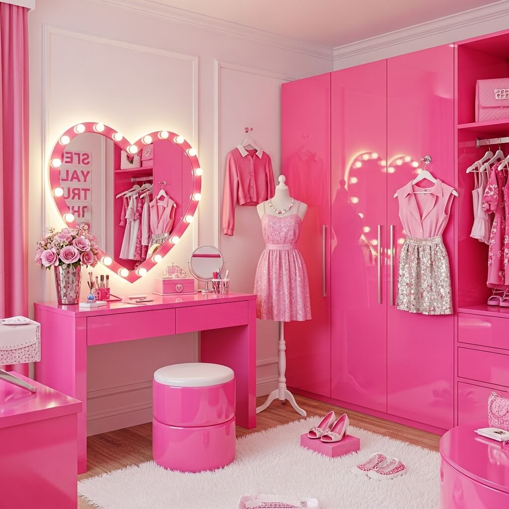 Even in the most playful Barbie-inspired space, organization is still key. Don’t sacrifice functionality for aesthetics — invest in good wardrobe systems, labeled storage, and proper drawer organizers, all dressed up in your Barbie color palette. A chaotic closet is chaotic regardless of how fabulous the walls are.