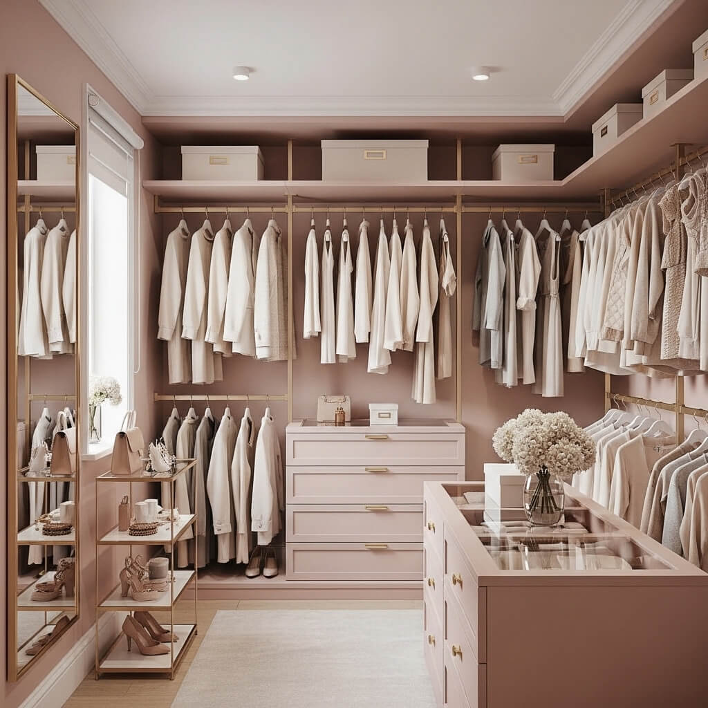 Blush pink — that soft, rosy, slightly muted tone — works exceptionally well in larger walk-in closet spaces because it adds color and warmth without dominating the room.