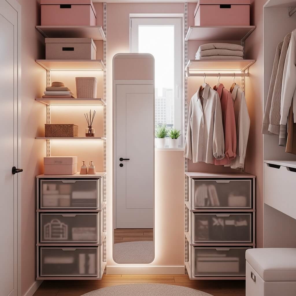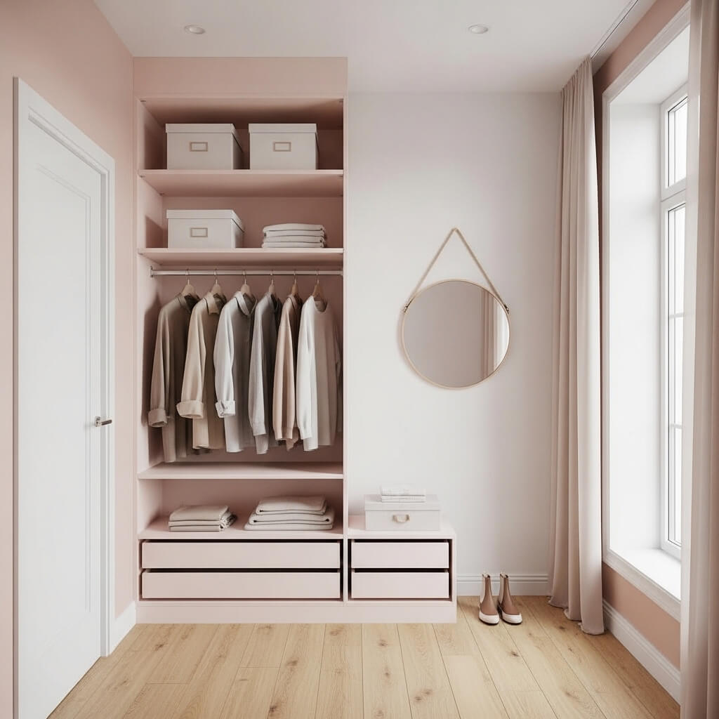 Don’t be afraid of pink in a small room. A common mistake people make is defaulting to white in a small space to “make it feel bigger.” While that logic has some merit, a soft blush pink actually creates warmth and coziness that makes a small dressing room feel intentional rather than cramped. Pair it with plenty of mirrors and good lighting, and you’ll be shocked at how spacious it feels.
