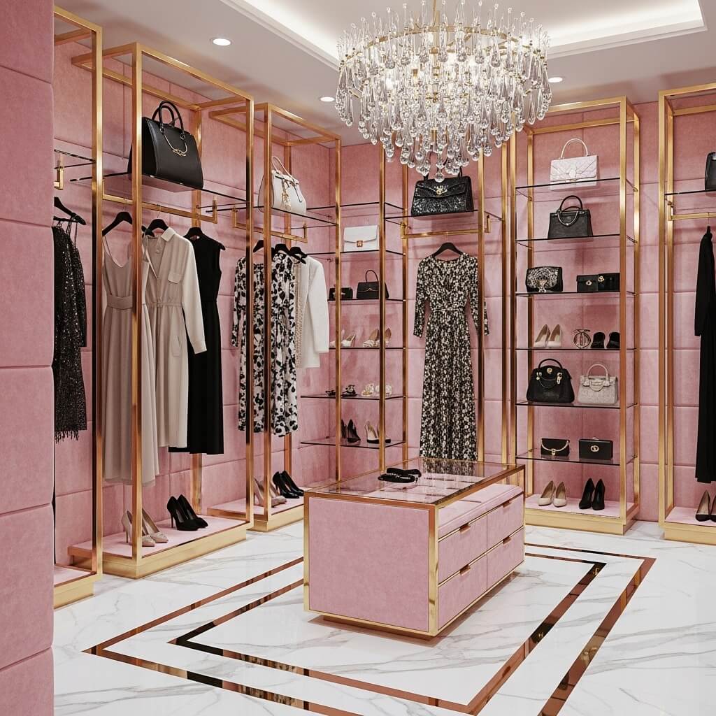 If pink is the star, gold is the co-star it absolutely deserves. The pink and gold luxury closet aesthetic is the design equivalent of a standing ovation — it’s confident, it’s radiant, and it demands attention in the absolute best way.