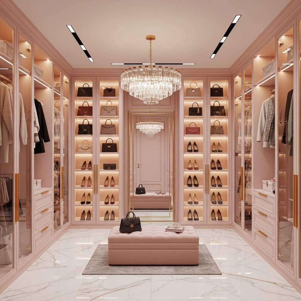 The elegant blush pink walk-in closet sits in that sweet spot between understated luxury and thoughtful design. It’s not as maximalist as the full glam approach, but it’s definitely not minimal either. It’s refined, curated, and quietly confident — the interior design equivalent of a perfectly tailored blazer.