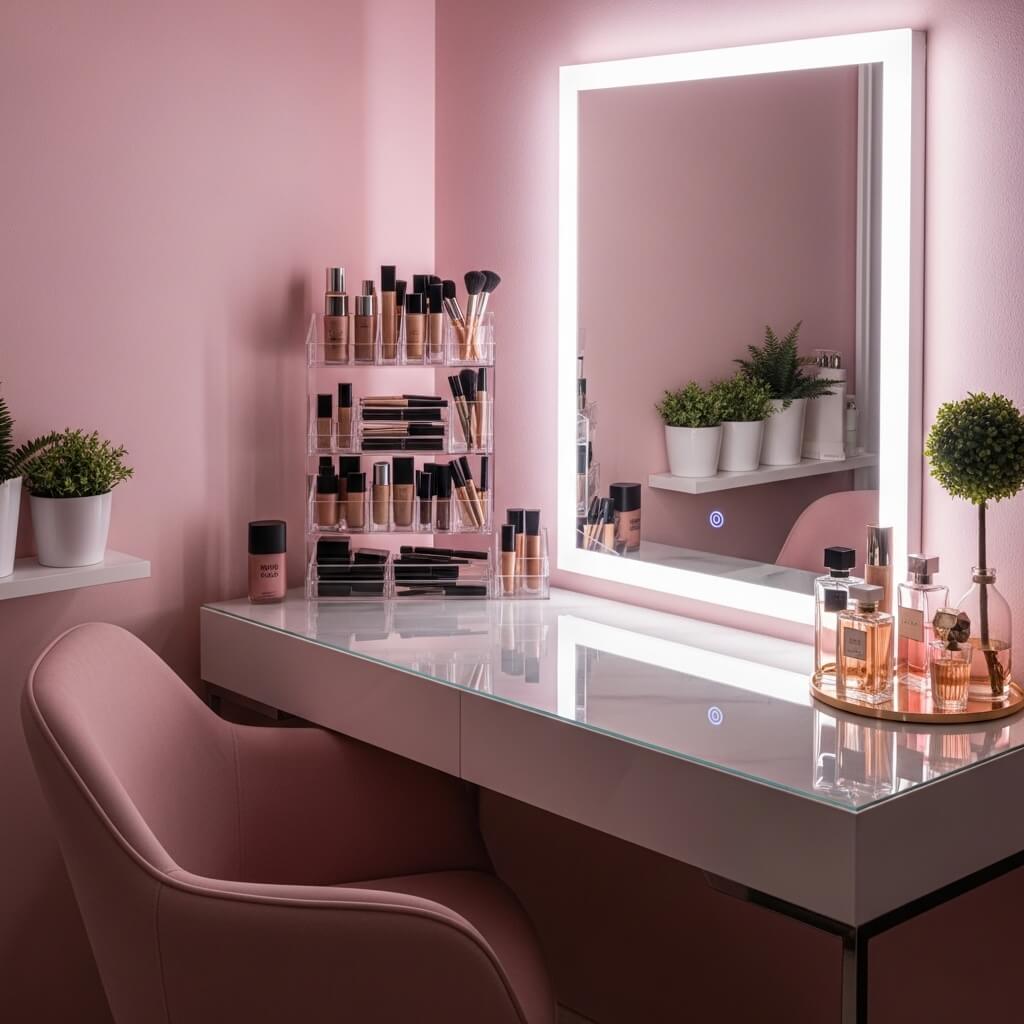 • A sleek pink or blush vanity desk with a drawer or two for makeup and accessories