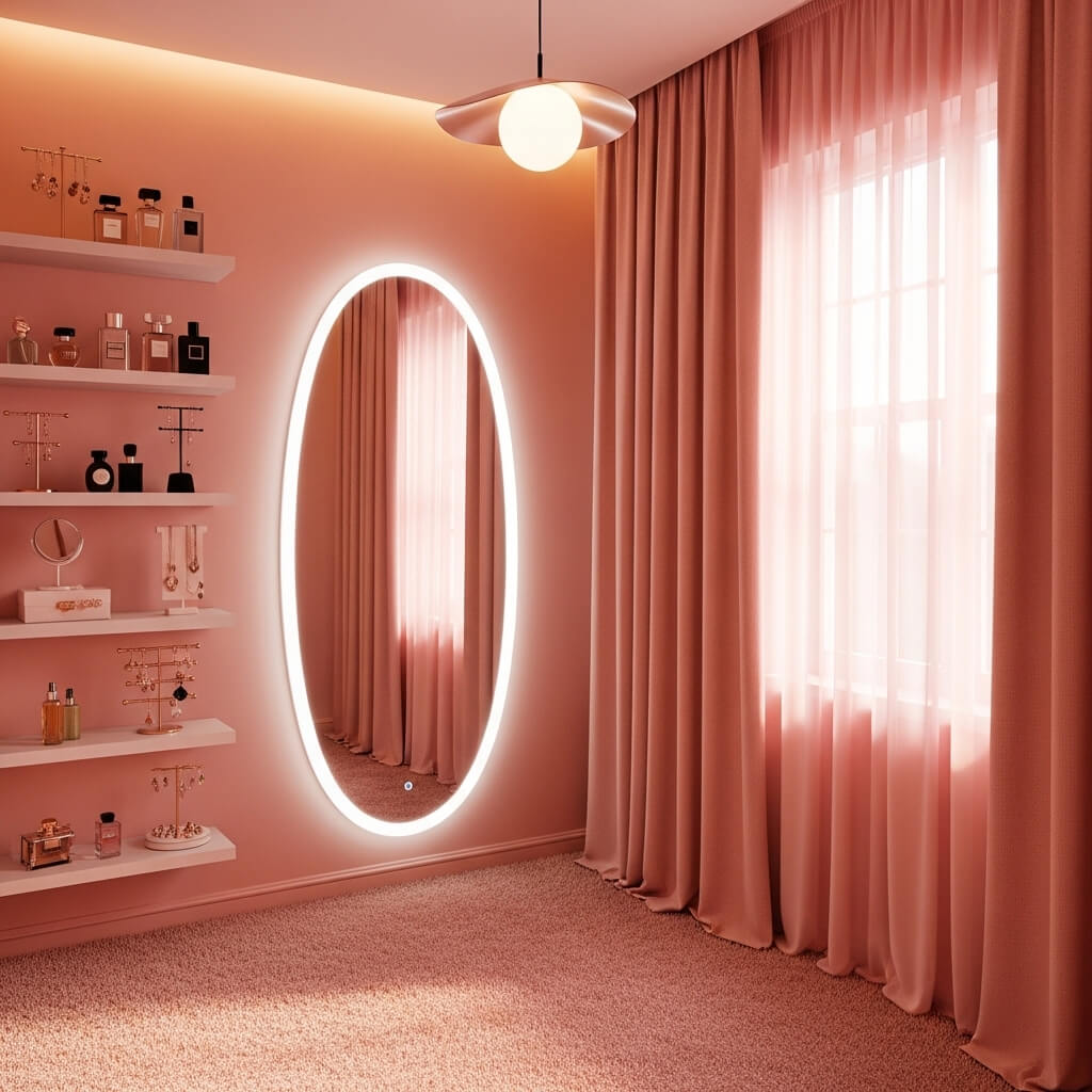 This is a detail that most people overlook, and it genuinely makes a huge difference. Cool white LED lighting (5000K–6000K) looks harsh and clinical — great for a hospital, not so great for a dressing room. Warm white (2700K–3000K) is the sweet spot: flattering, soft, and beautifully complementary to pink tones. When you combine warm LED lighting with blush walls and soft textures, the room almost glows from within.