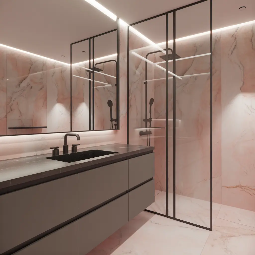The contrast between soft pink marble and matte black fixtures is absolutely stunning. I used pink marble on my vanity and shower walls, then added matte black faucets, showerhead, and cabinet hardware. The black adds edge and modernity that prevents the pink from feeling too sweet or traditional.