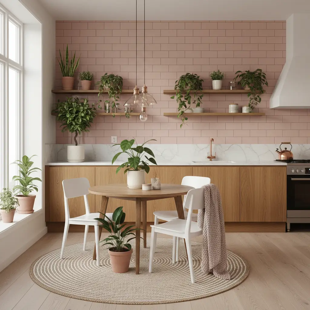 - Warm pinks (coral, peach) suit warm-toned kitchens