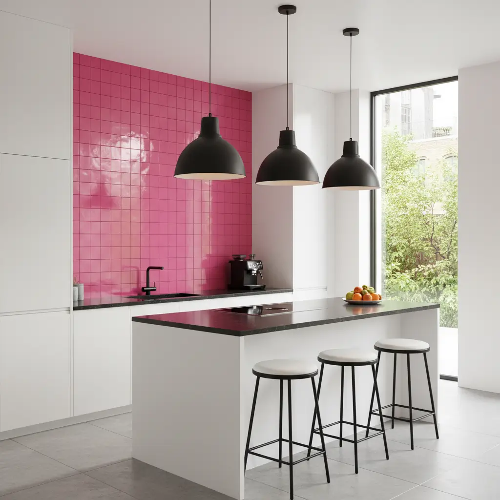 Bold pink accent wall tiles concentrate dramatic color in defined areas. This focused application creates impact without overwhelming entire kitchens.