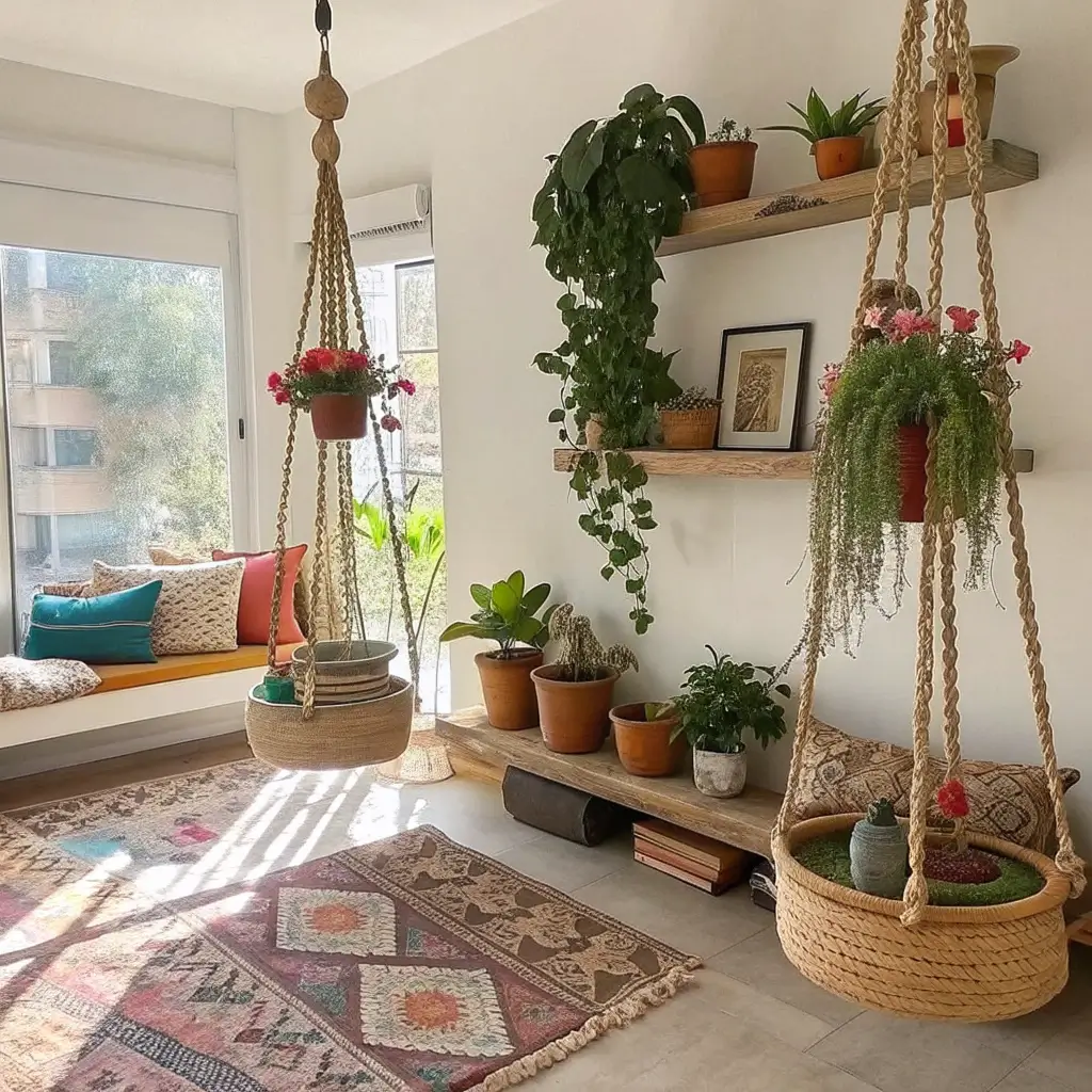 Rope hanging shelves bring those 70s vibes in the best way possible. They add movement and texture while keeping your plants at different heights, creating visual interest that regular shelves can’t match. Plus, they swing slightly when you water them, which is oddly satisfying.