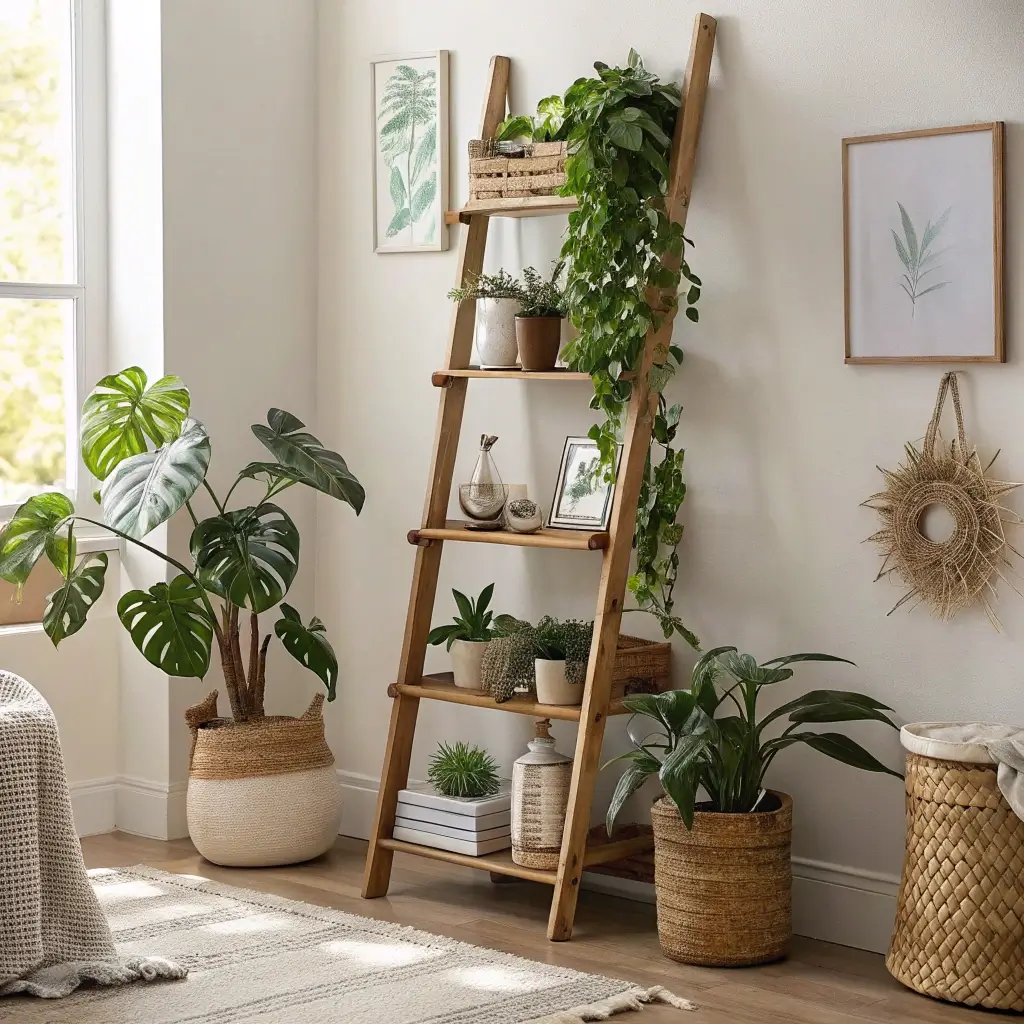 Mix plants with other items for visual interest. All plants can look overwhelming on ladder shelves. I add books, candles, and decorative objects between plant groupings. It looks intentional rather than like you’re running a greenhouse in your living room.