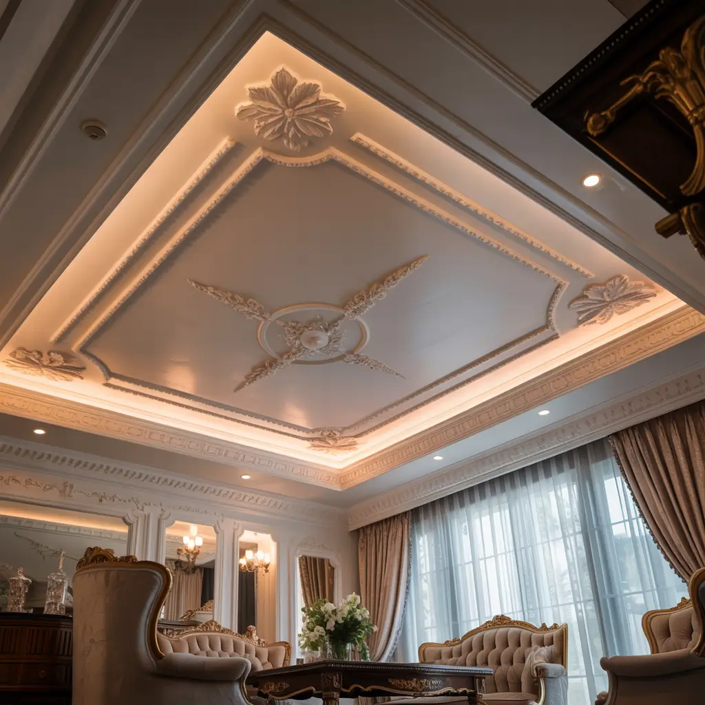 Crown molding in POP creates that classic, sophisticated look. My parents’ design features a subtle tray ceiling with beautiful crown molding, and the traditional elegance works with their classic furniture perfectly.