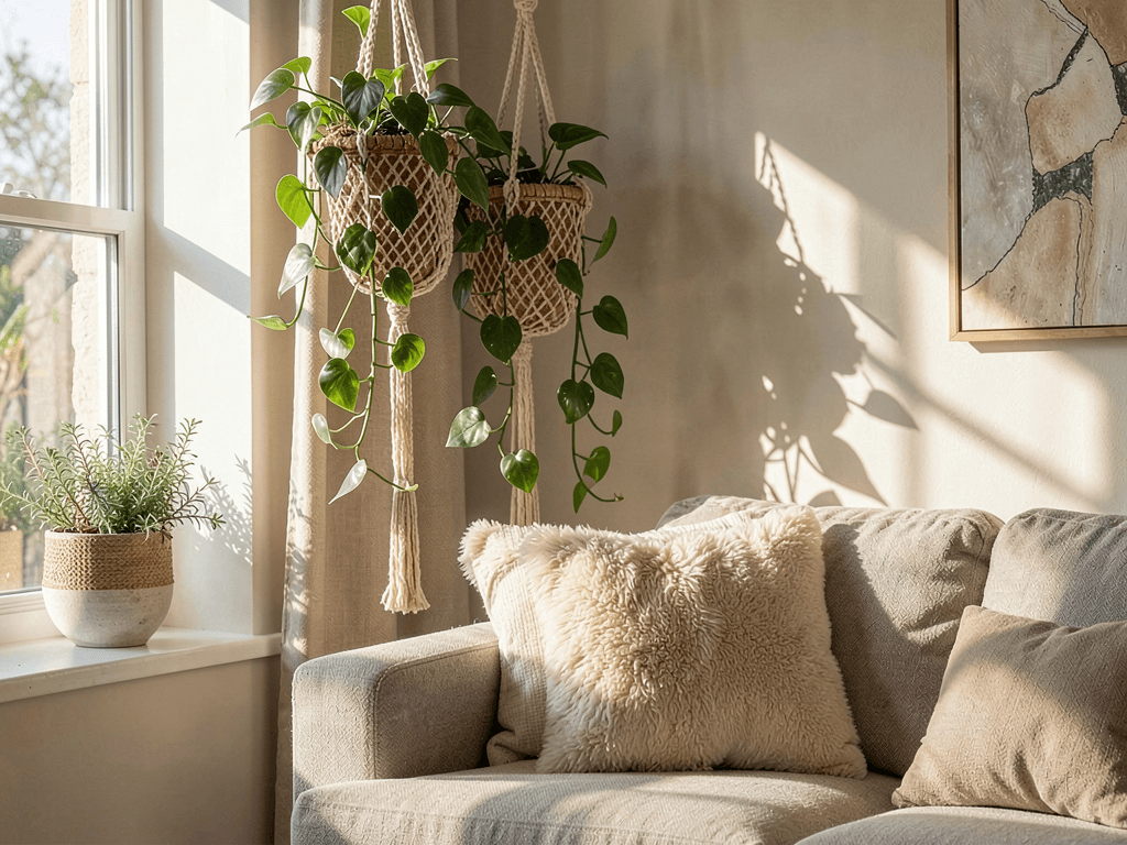 Where you hang your macrame pothos makes or breaks the whole look. Near windows works brilliantly – you get natural light for the plant and shadows that create depth on your walls.