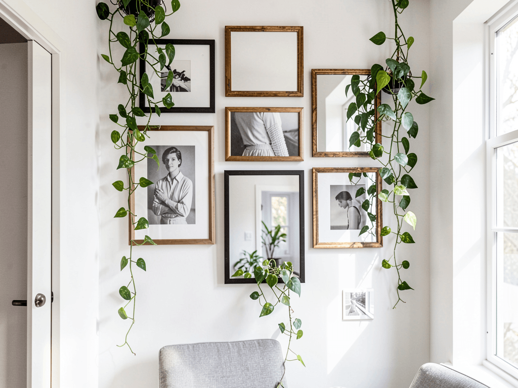 Start with lightweight frames or mirrors – the pothos adds weight over time. Command strips or small hooks help guide vines without damaging walls.