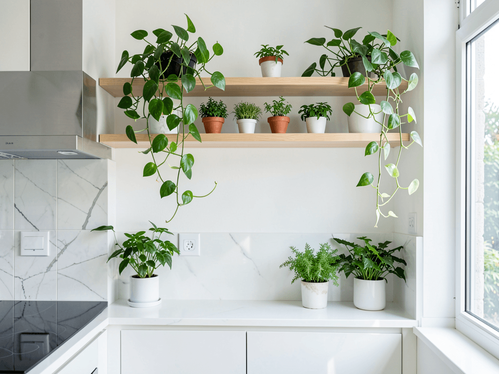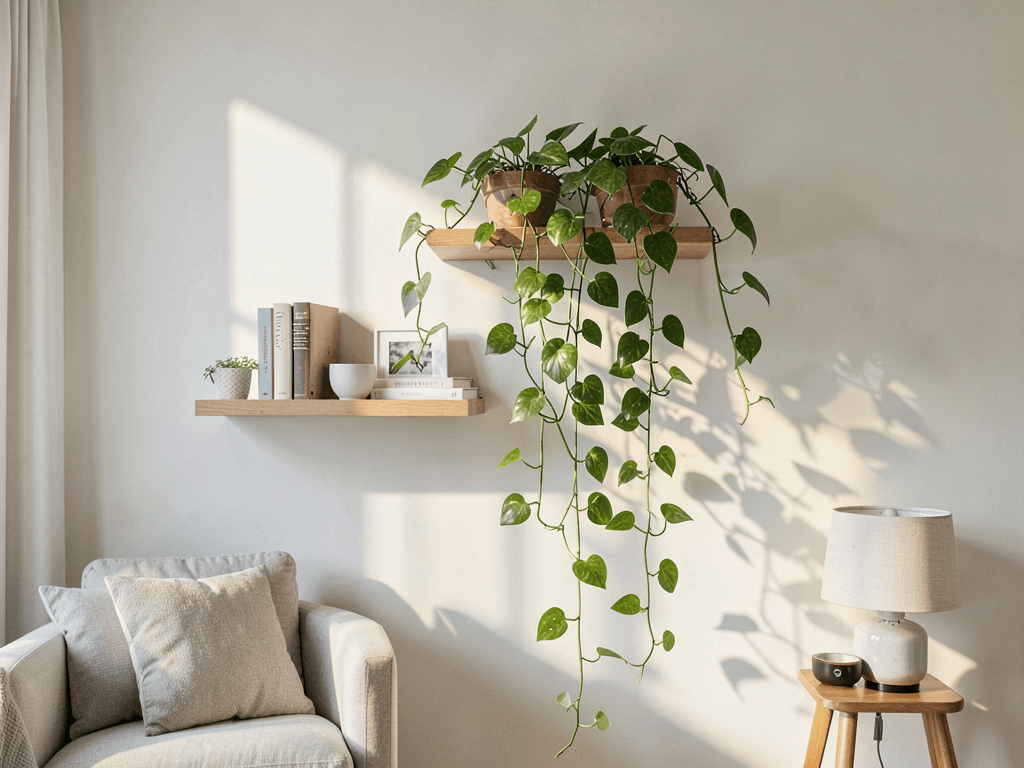 Floating shelves with pothos create living curtains that soften hard walls and add movement to static spaces. My hallway transformation using this technique still makes me stupidly happy every time I walk through.