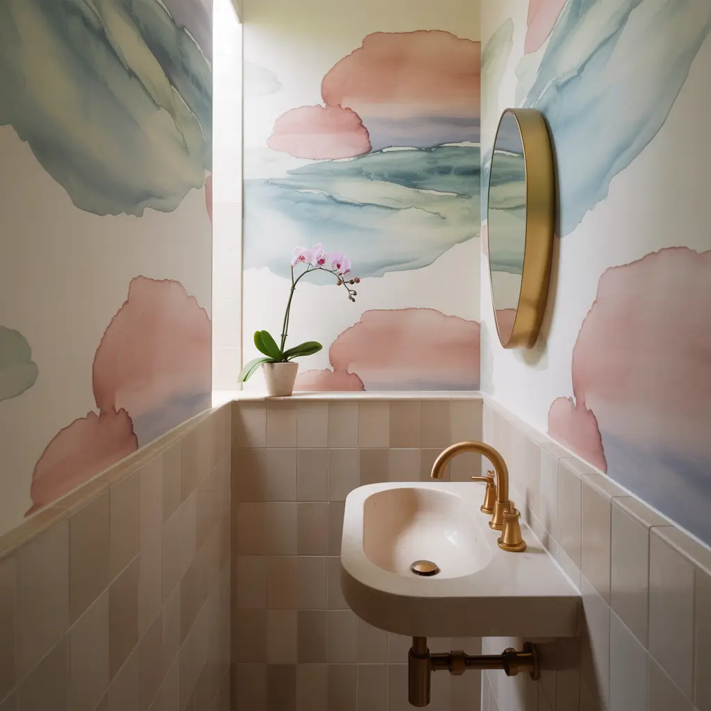 Abstract watercolor wallpaper feels like commissioning an artist for your walls without the commission prices. These patterns bring movement and flow to static spaces, making tiny powder rooms feel alive and dynamic.
