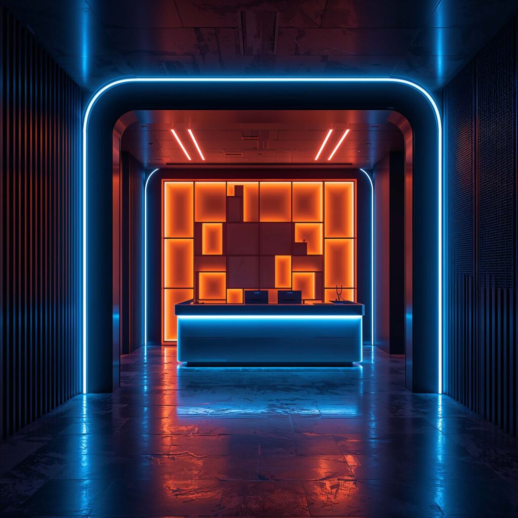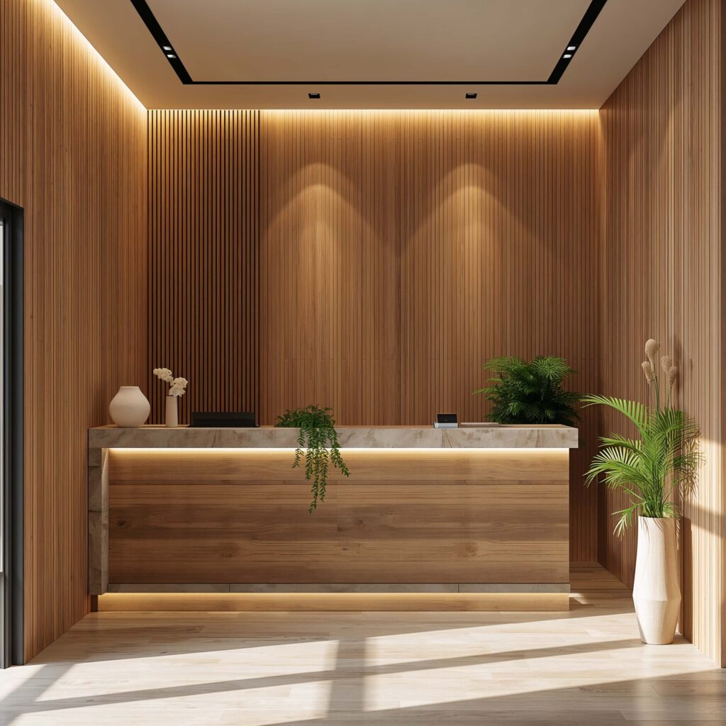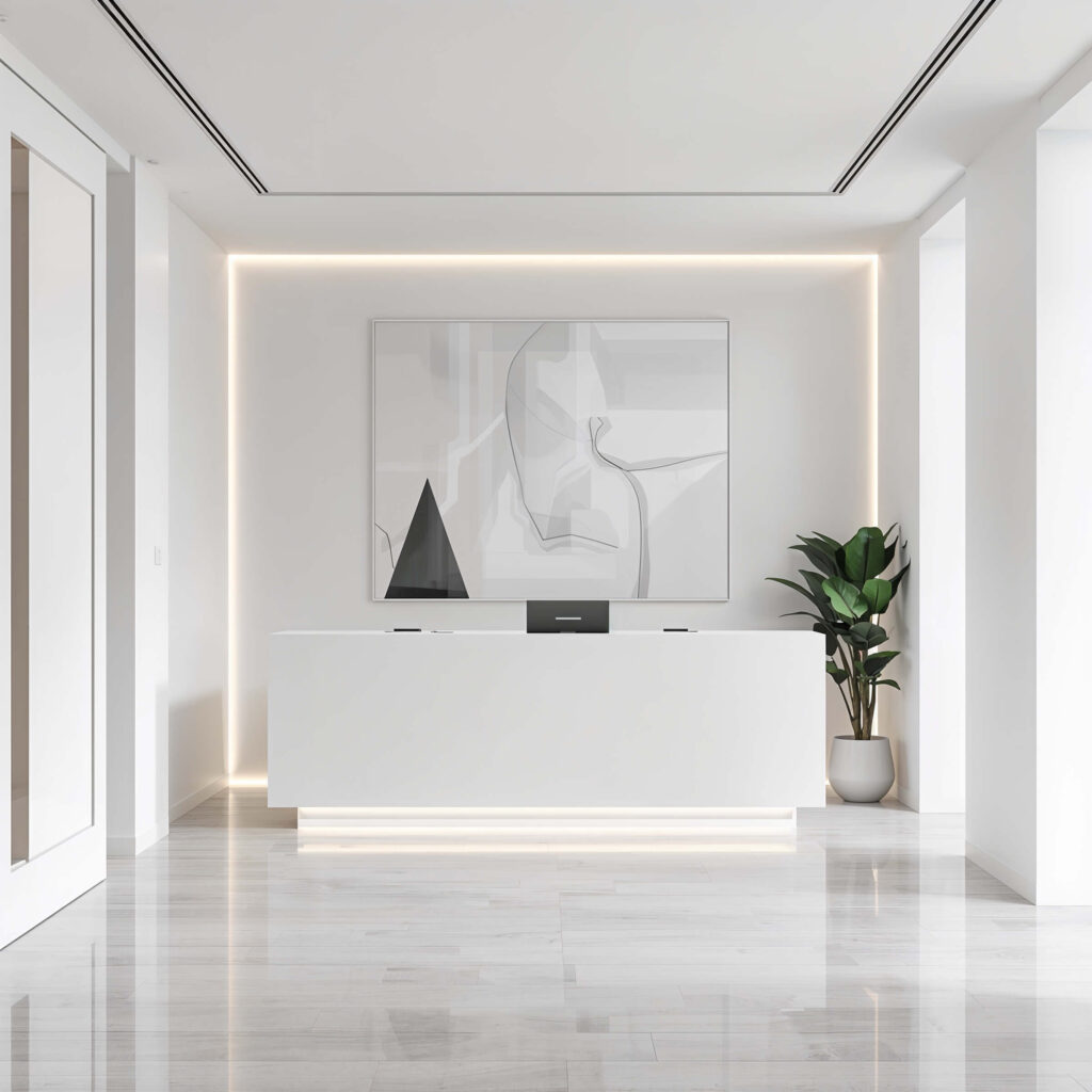 - A floating or wall-mounted reception desk (saves floor space and looks incredibly sleek)